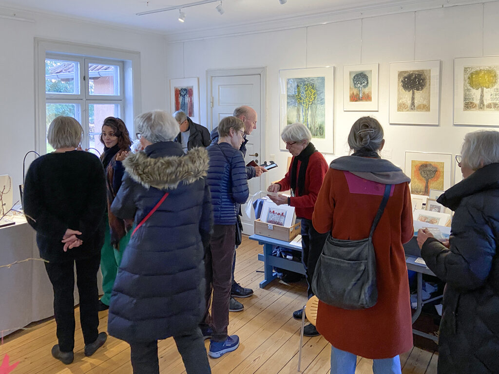 12 kunstnere sælger grafik, malerier, keramik, smykker og glaskunst.